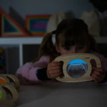 Ce magnifique cadre en hévéa doté de poignées faciles à prendre en main contient un panneau fascinant qui brille dans le noir. Activé en laissant entrer une lumière vive, il brille comme par magie d'un bleu éclatant lorsqu'il est emporté dans une tanière sombre. Les enfants adoreront regarder le liquide incandescent tourbillonner et s'écouler lorsqu'ils tordent et font tourner le panneau.
