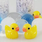 Eau, glycérine, colorant alimentaire, billes d'eau, paillettes blanches, figurines canard