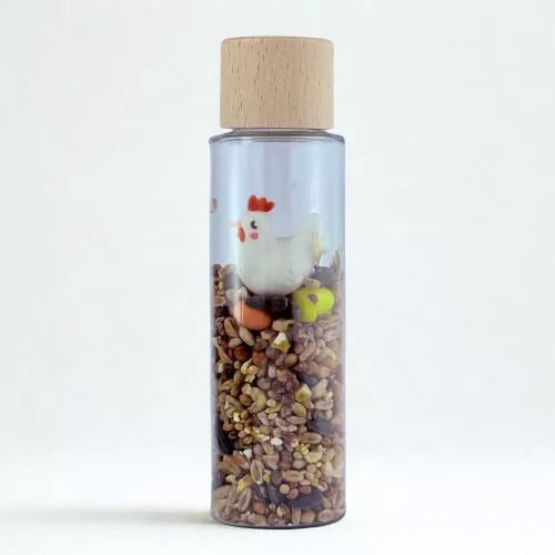 Une petite poule malicieuse, des grains colorés et de jolis sons à découvrir… Cette bouteille sensorielle transporte bébé directement dans l’univers de la ferme. À chaque secousse, les graines roulent, s’entrechoquent et produisent un doux bruit qui stimule son écoute et éveille sa curiosité.