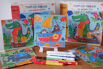 6 cartes à colorier, 6 feutres à encre magique, 3 feutres magic motif, 1 chevalet et une notice pas à pas.