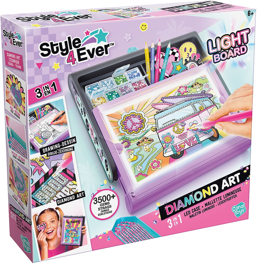 Cette mallette lumineuse 3 en 1 est idéale pour réaliser des créations crayonnées ou diamantées ! Avec la tablette lumineuse, reproduis et dessine, crée tes stickers diamant ou encore réalise des posters selon les 2 techniques ! Facile à transporter, range tous tes accessoires à l'intérieur !