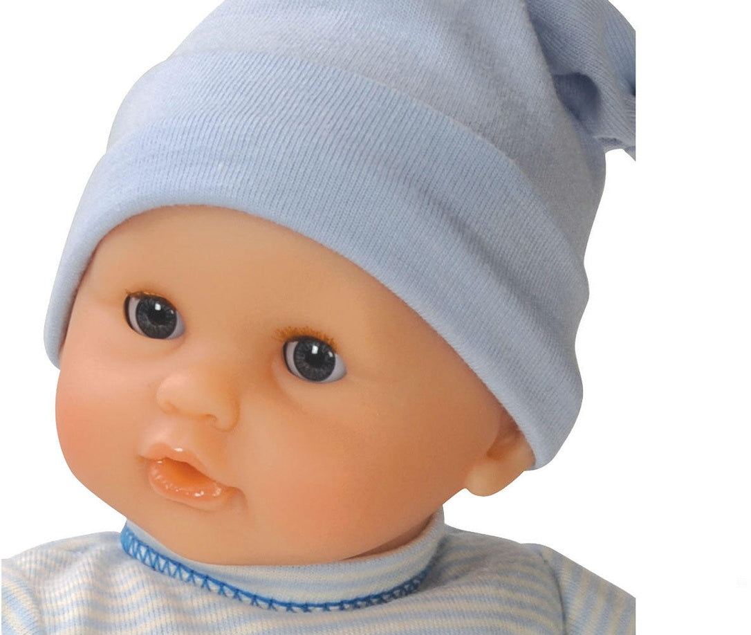 Son visage, ses bras et ses jambes, à la délicate senteur de vanille, sont en vinyle doux au toucher. Son pouce peut se maintenir dans sa bouche comme un vrai bébé. Avec ses yeux dormeurs, il fait dodo quand on le couche sur le dos. Il est habillé d'un pyjama et coiffé d'un bonnet.