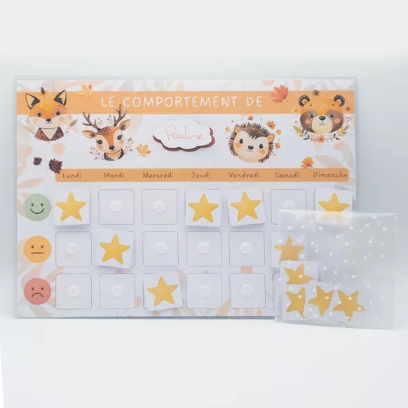 Le kit contient : 1 tableau A4 plastifié, 7 vignettes étoiles et 1 étiquette prénom. Présenté dans un joli sachet de rangement transparent à pois blancs.