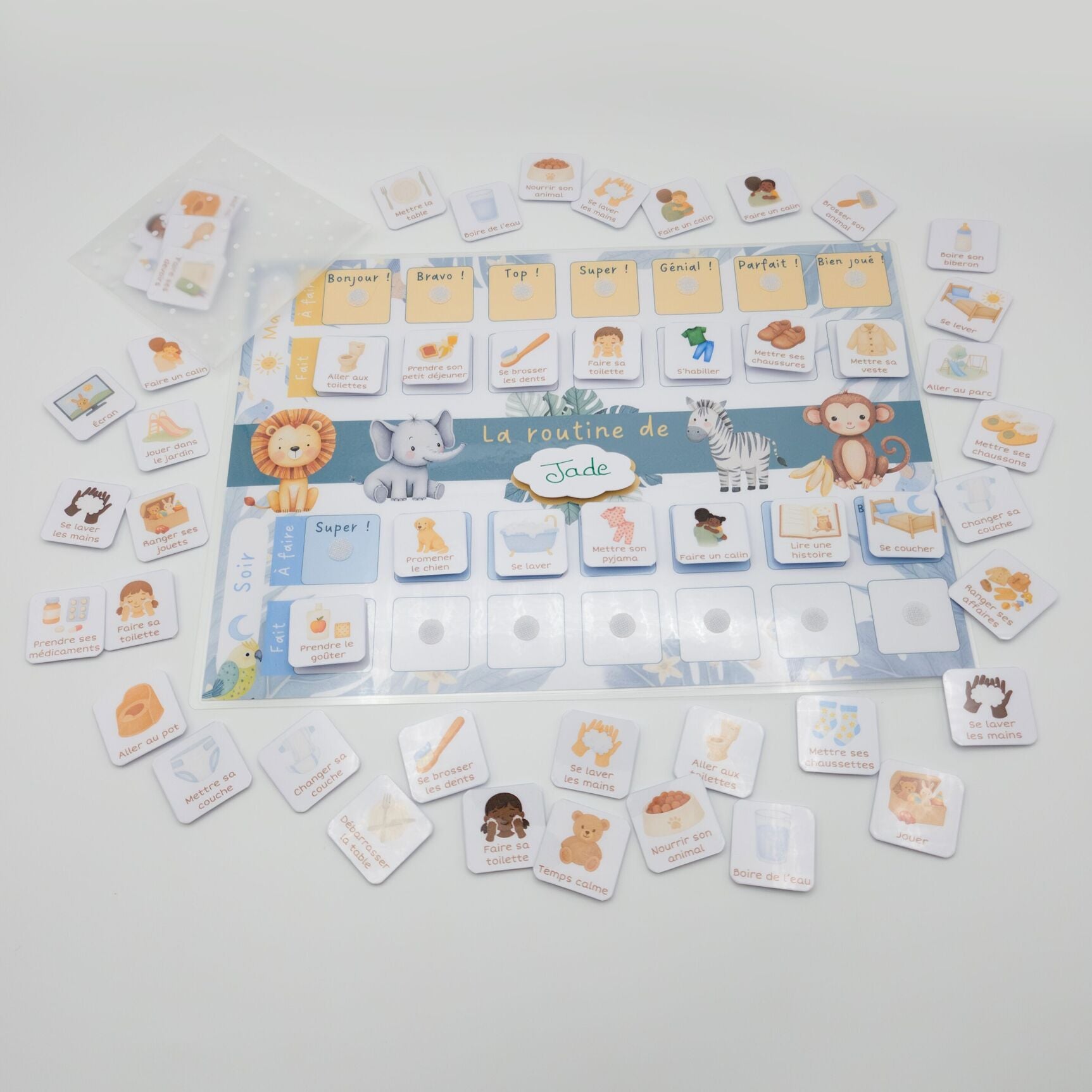 Le kit contient : 1 tableau A4 plastifié, 54 vignettes d’actions avec scratch doux (faciles à manipuler), une étiquette prénom et un joli sachet de rangement.